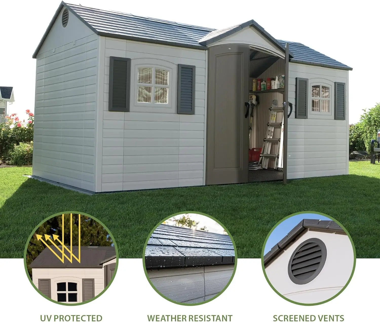 - Spacious 8 x 15 ft footprint with a Desert Sand exterior and a high-pitched roof for quick rain and snow drainage, designed to maximize usable interior space for long items.